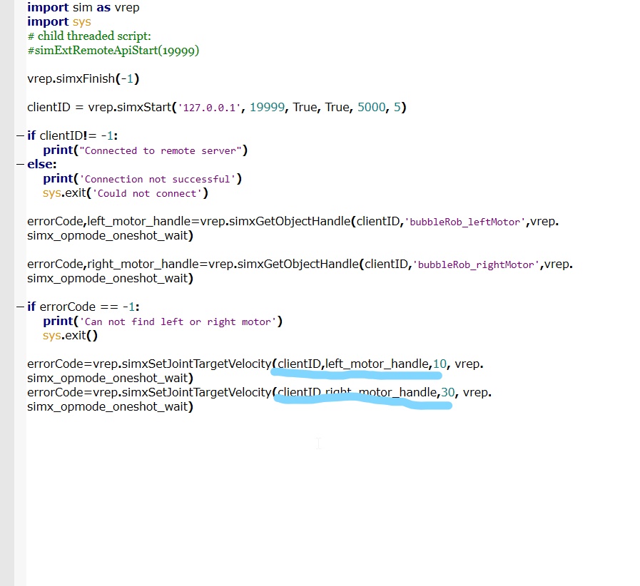 errorCode=vrep.simxSetJointTargetVelocity(clientID,right_motor_handle,30, vrep.simx_opmode_oneshot_wait)